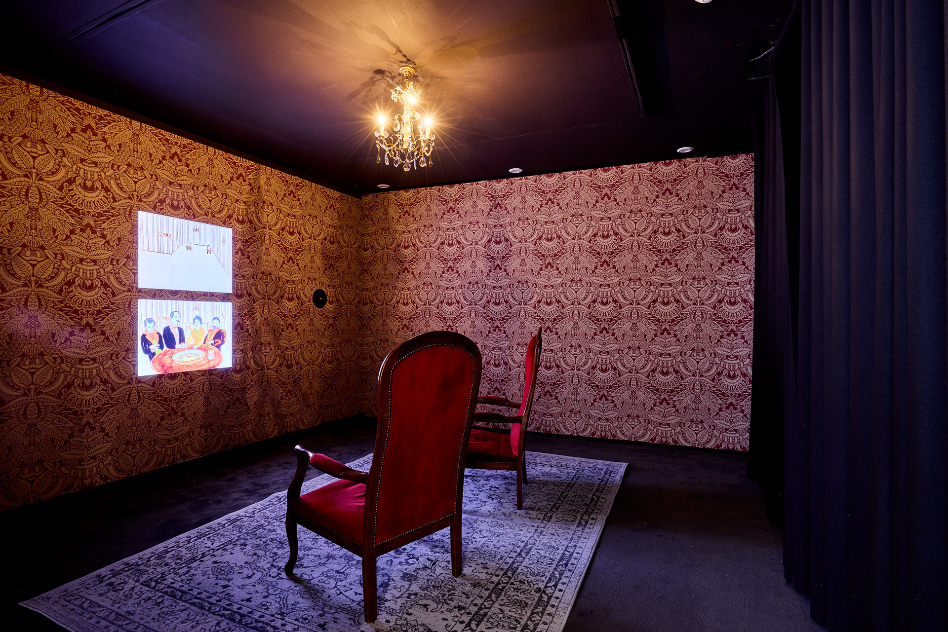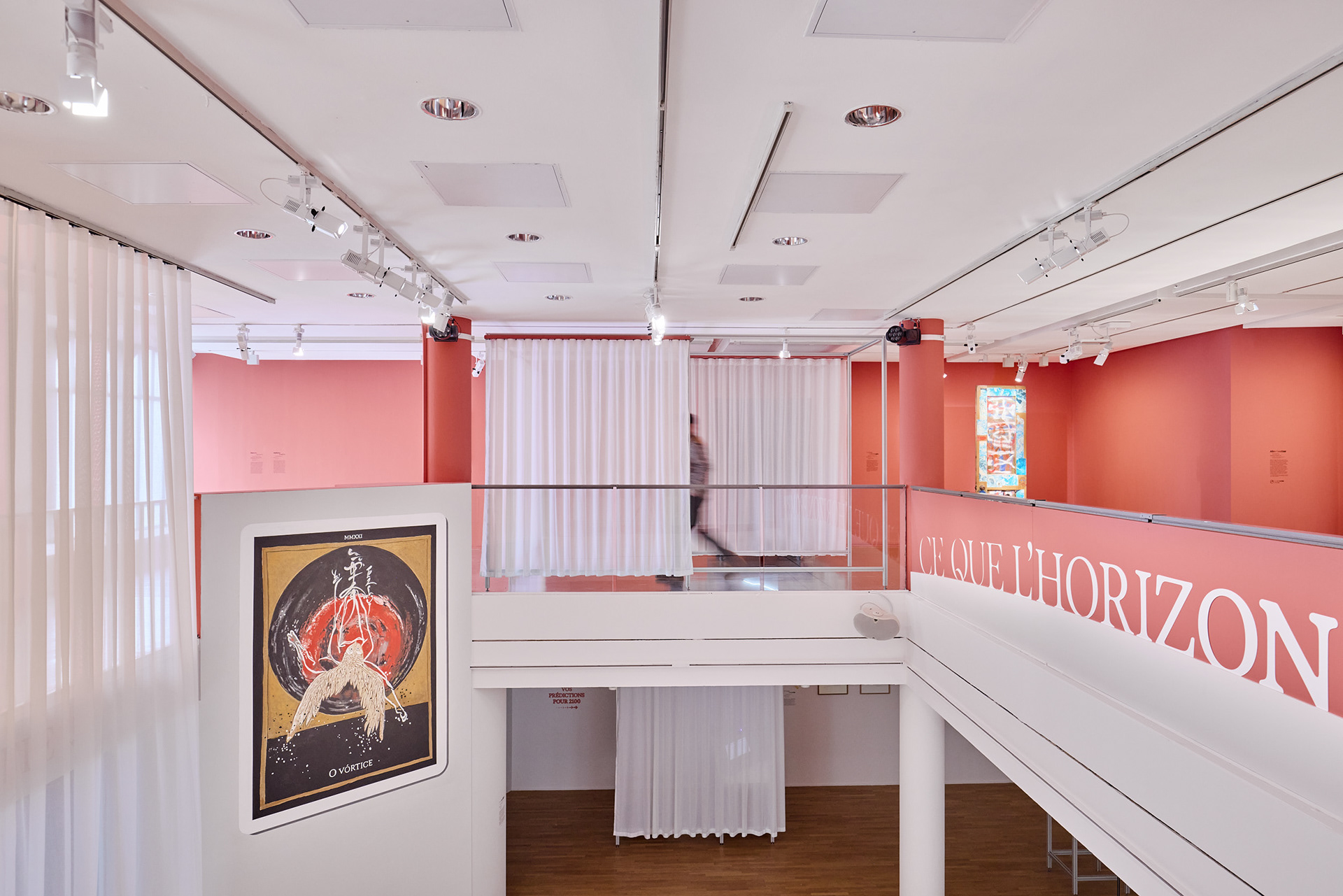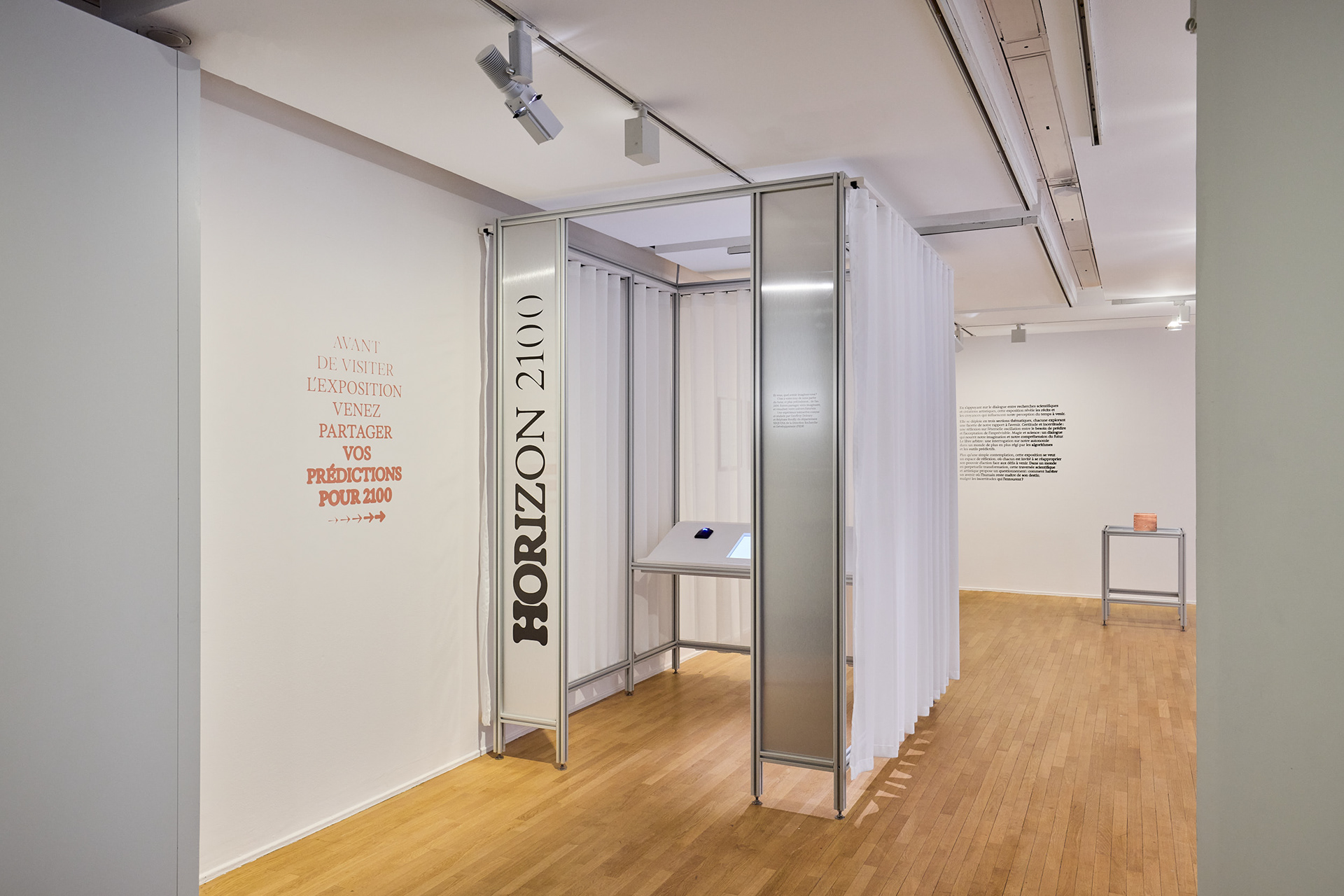 Dans un monde en perpétuel changement, cette exposition questionne notre perception de l’avenir et notre capacité à l’anticiper. Entre certitudes et incertitudes, magie et sciences, la scénographie de cette exposition oscille entre le baroque de la nécromancie et la rigueur de la science : les profilés aluminium des meubles de laboratoire rencontre les textiles et miroirs des voyant.e.s.