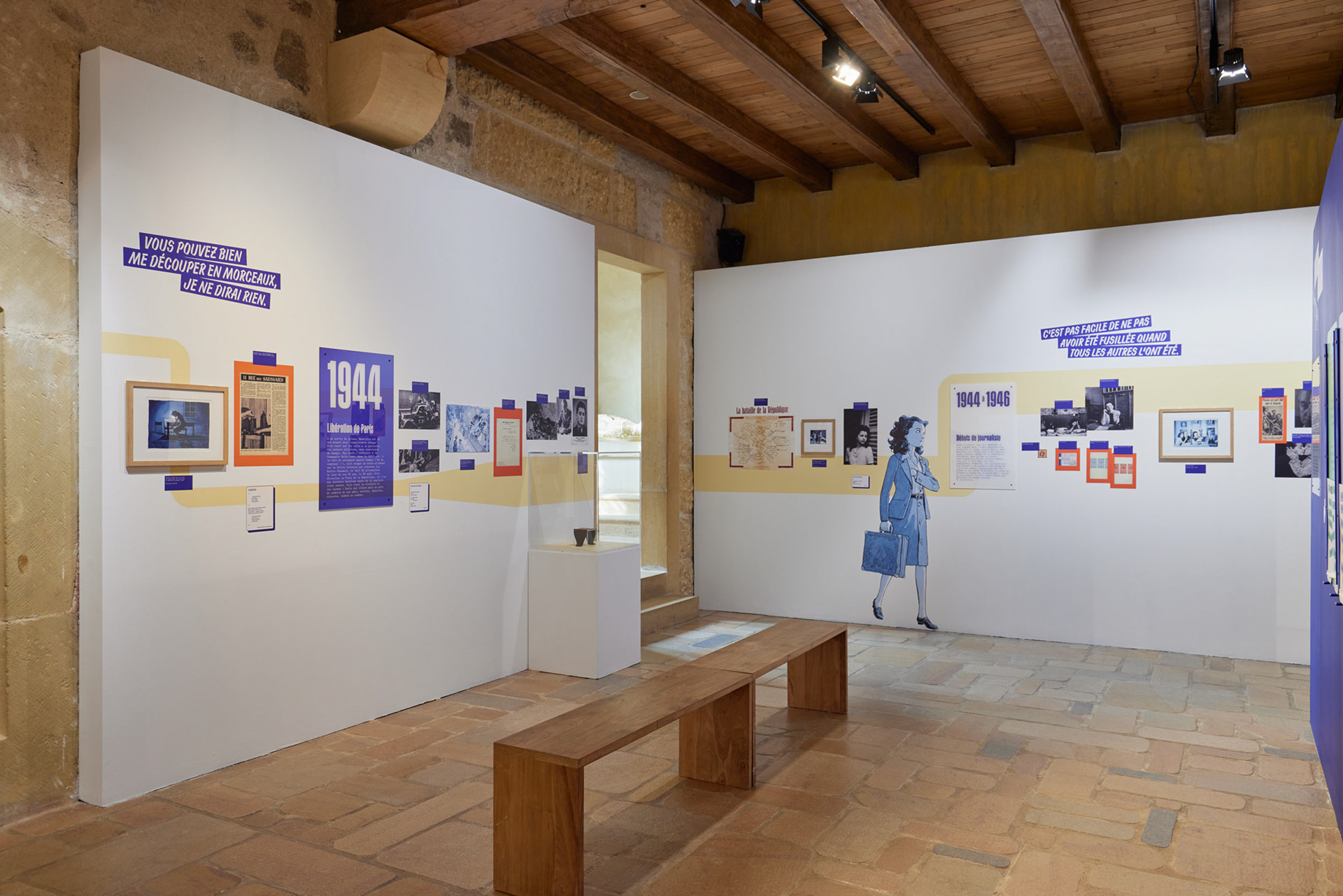 A l’image de fils d’Arianne, des lignes sinueuses et protéiformes guident les visiteuseur.se.s dans les trois temps de l’exposition : La ligne du temps de la frise chronologique invite à la découverte de la vie de Madeleine Riffaud ; La ligne de l’onde sonore incite à l’écoute des voix des protagonistes à l’origine de l’album "Madeleine, résistante" ; Les lignes de fils à broder tissent des liens entre résistantes d’hier et d’aujourd’hui.